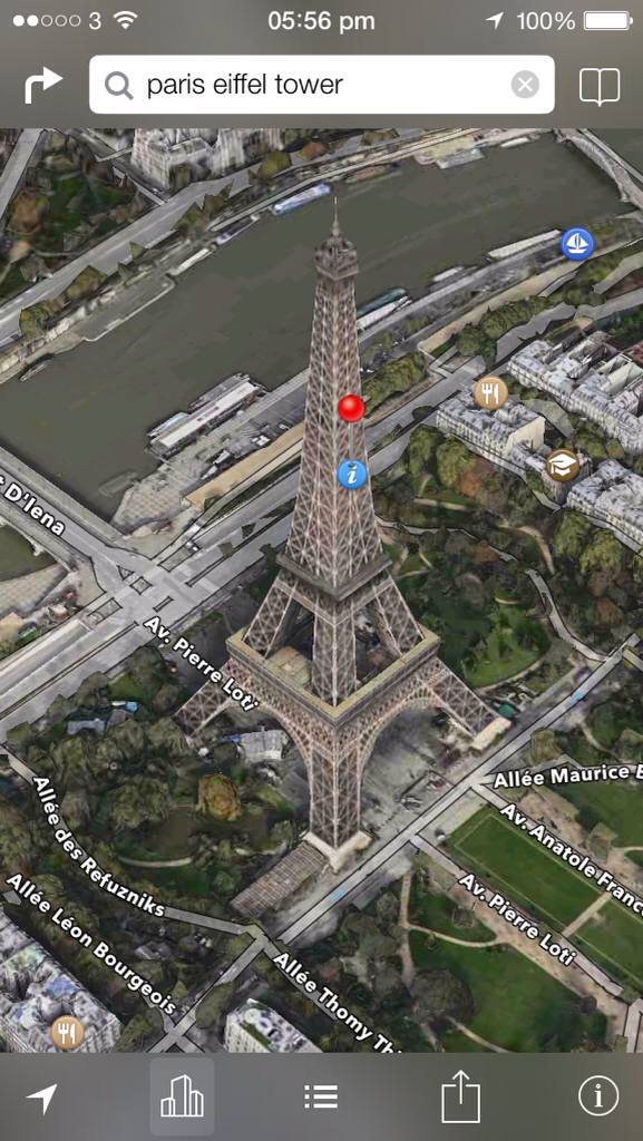 When using Apple Maps around big cities the quality and detail in the 3D images can be mind blowing as seen here around the Eiffel Tower in Paris