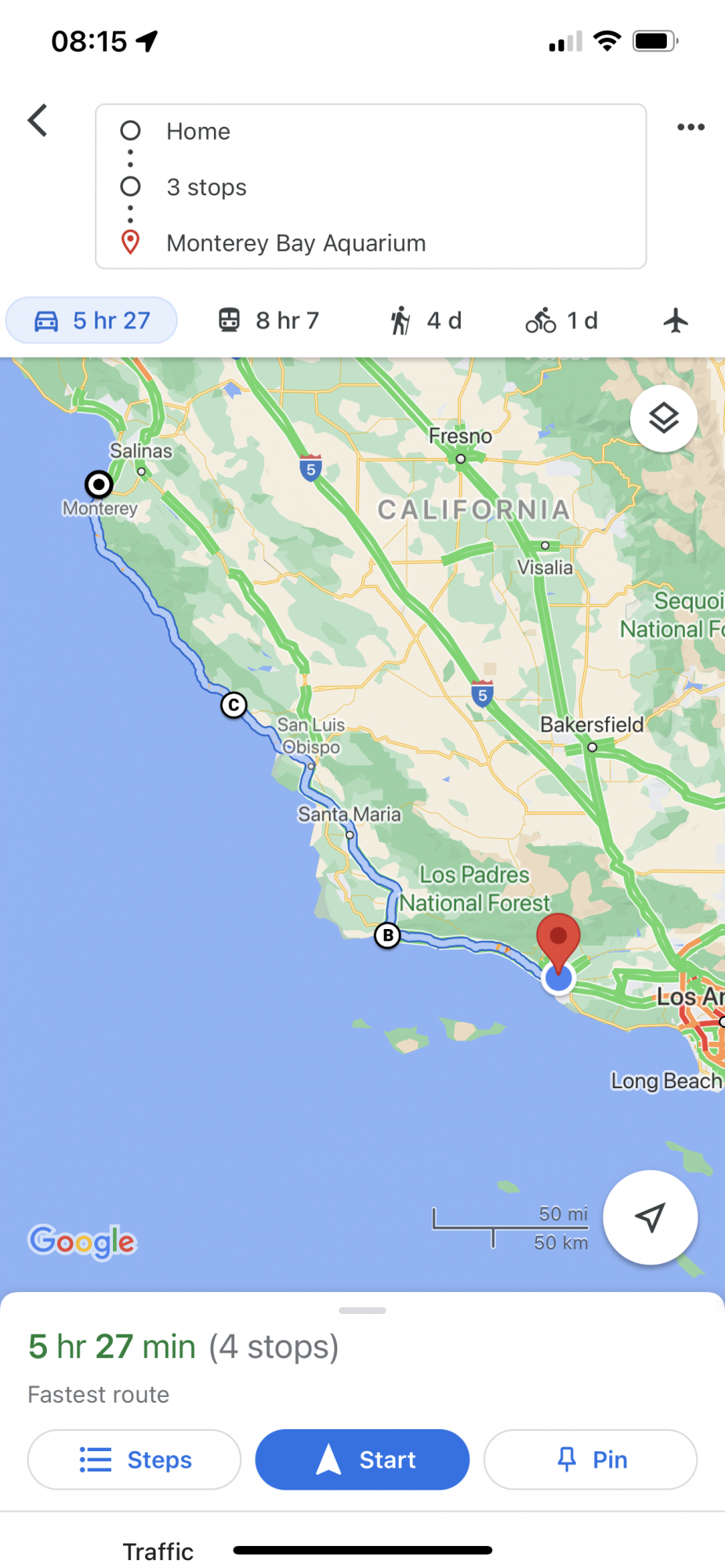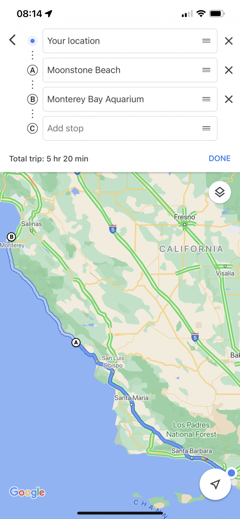 Recent trip to Napa Ca. I wanted to stop at Monterey Bay Aquarium, Winchester House, and Golden Gate Park on my trip up and planned for two days. In Google Maps I can place the entire trip with multiple stops adjusting on the fly as traffic or other aspects change. I cannot do that in Apple Maps. I wanted to do the US 1 to Monterey but AM would not let me even choose the route on either my iPad or iPhone. Surprisingly GM would not either on an Apple device but I could pick a midtrip point like Moonstone to force it on the map. However it would allow GM to mapit on my Android device. (see pics below)