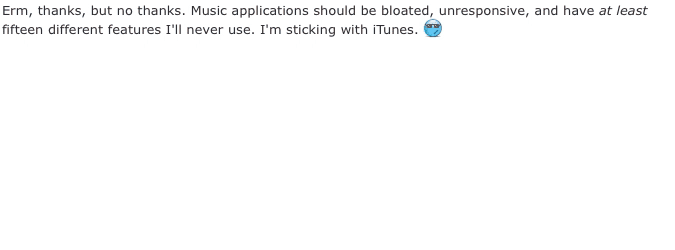 Im trying to help the community too, I’m just saying we should weigh the risk of giving your credentials on a third party website. Odds are this guy has good intentions and wouldn’t do anything wrong, but I can’t take that risk. Hopefully this inspires apple to release a web player of their own.I think the frustration comes from someone providing a solution to help the community and they get bashed by a group of people who have no intention of using it. Small independent developers used to be inspired by our forums, but now I’m surprised they even bother.
