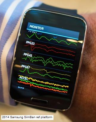 Samsung's Sim Band health watch reference design available for anyone to use, including sensors for ECG, PPG, galvanic skin response, bio-impedance, and skin temperature.