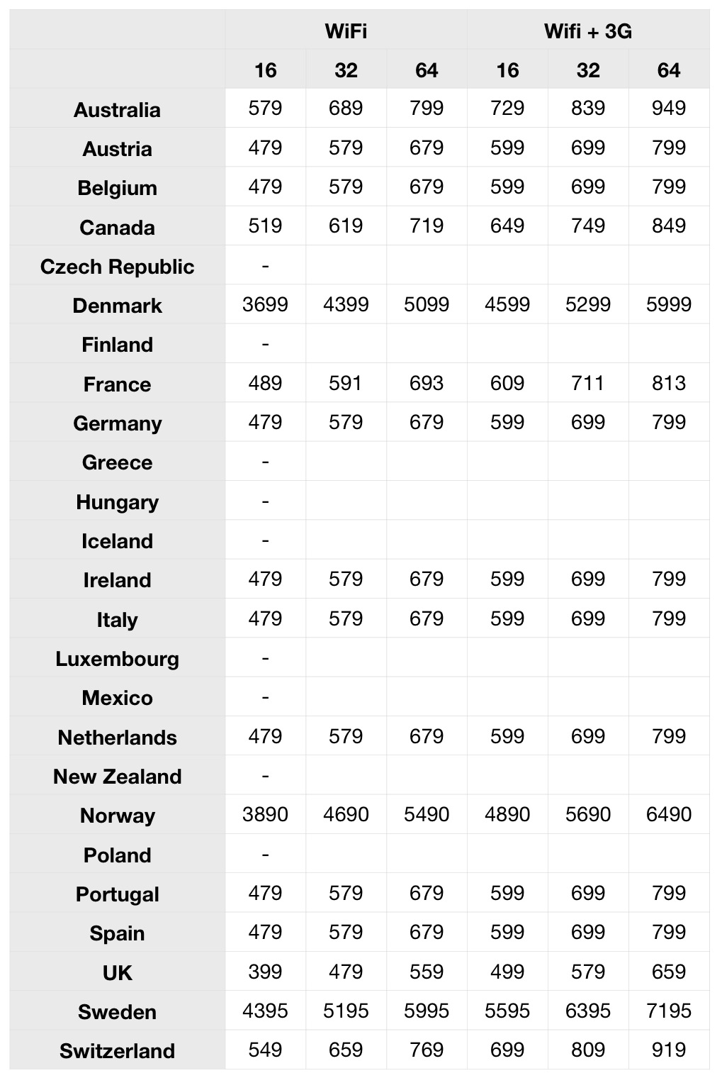 iPad 2 with Wi-Fi will be available in Australia, Austria, Belgium, Canada, Czech Republic, Denmark, Finland, France, Germany, Greece, Hungary, Iceland, Italy, Luxembourg, Mexico, Netherlands, New Zealand, Norway, Poland, Portugal, Spain, Sweden, Switzerland, the UK and Ireland on March 25 for a suggested retail price of 479.00 inc VAT (395.87 ex VAT) for the 16GB model, 579.00 inc VAT (478.51 ex VAT) for the 32GB model, 679.00 inc VAT (561.16 ex VAT) for the 64GB model. iPad 2 with Wi-Fi + 3G will be available for a suggested retail price of 599.00 inc VAT (495.04 ex VAT) for the 16GB model, 699.00 inc VAT (577.69 ex VAT) for the 32GB model and 799.00 inc VAT (660.33 ex VAT) for the 64GB model. iPad 2 will be available in Hong Kong, Korea, Singapore and additional countries in April, and in many more countries around the world in the coming months. Further international availability and pricing will be announced at a later date.