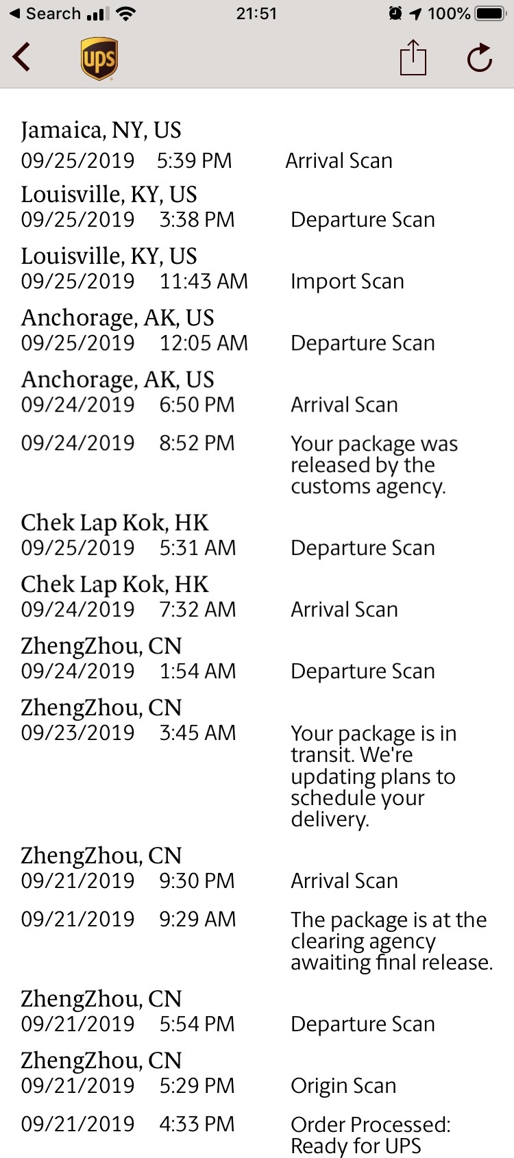 This is a volume deployment that clears customs en masse as a cohort of like 100k to 200k units, and is subsequently transported on a flight specifically chartered for the purpose. The standard UPS tracking system isn't really, geared for this sort of thing. There are scans on this shipment with status messages that literally only appear on *this shipment*.