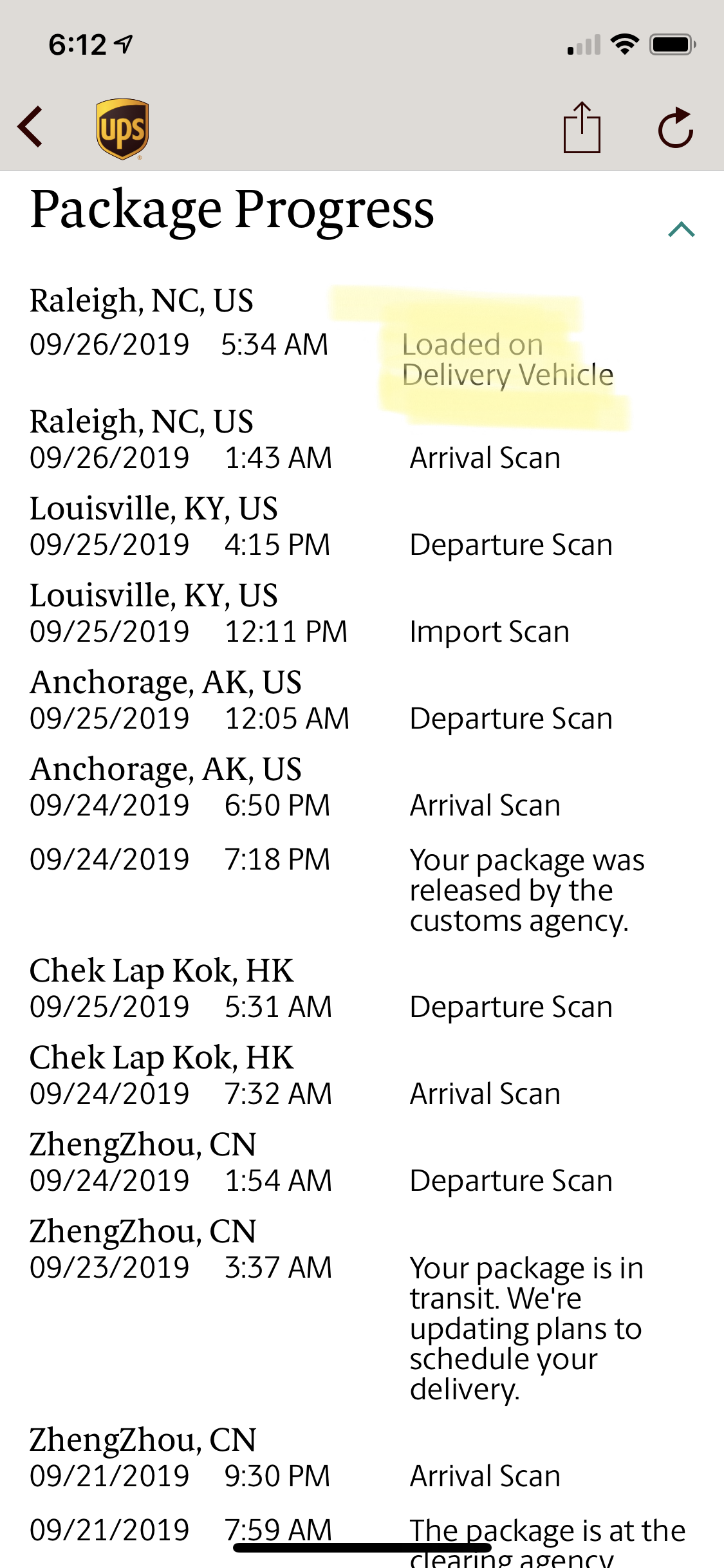 | Current Event | Out for Delivery | 09/26/2019 8:28 A.M. | Urbana, IL, United States | Out For Delivery Today |