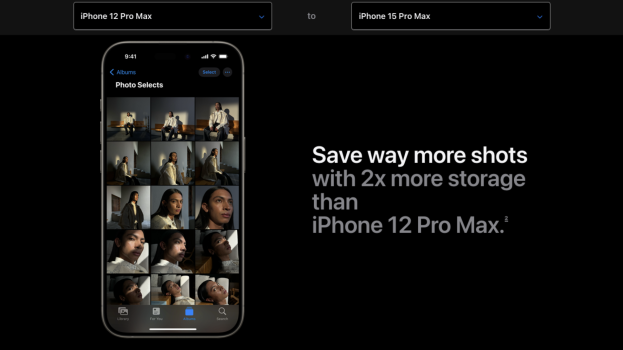 The website allows customers to compare the iPhone 11, 11 Pro, 11 Pro Max, 12, 12 mini, 12 Pro, and 12 Pro Max to the iPhone 15, iPhone 15 Plus, iPhone 15 Pro, or iPhone 15 Pro Max.