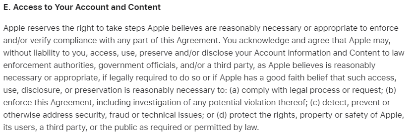 So the real issue is we need to fix how cloud storage agreements work. There is no excuse for this policy to exist as you quoted.As someone else already said, you don't own any server space on iCloud. You're renting it and entered into a legal agreement with Apple regarding it. Here's the document: