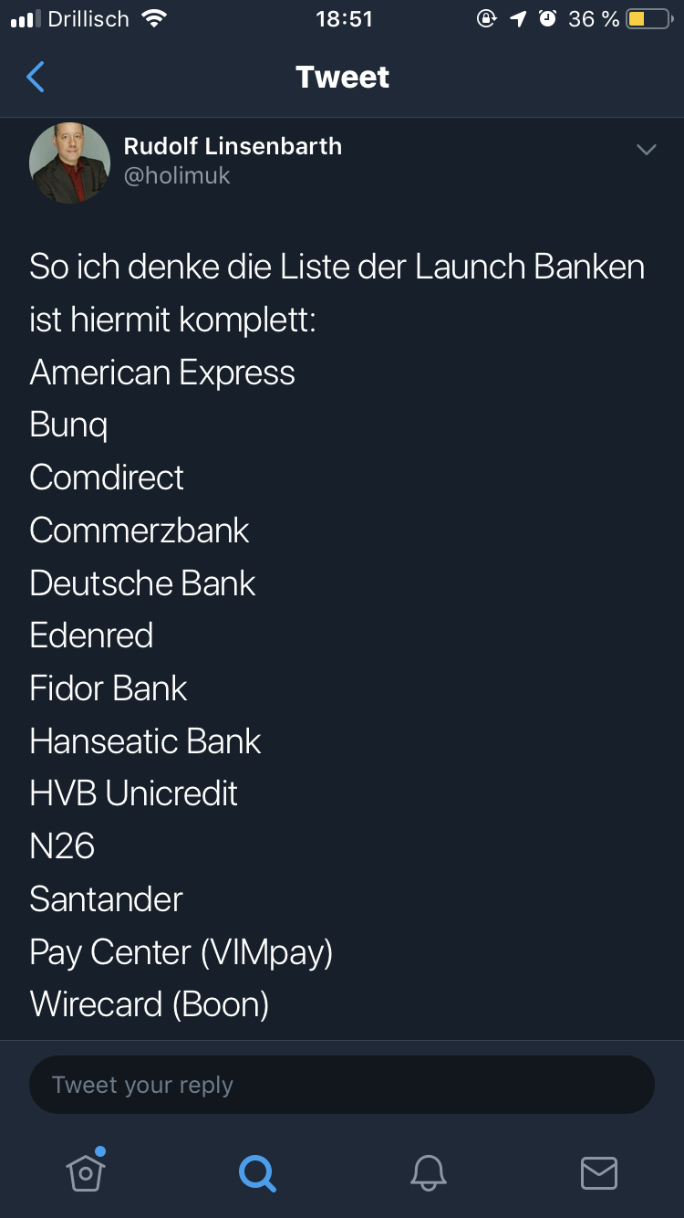 Which are the banks 12 and 13?Yes, I’m surprised at that as well! But, and this part of the information is just my personal speculation, it was all a strategy. And it seems to have worked! We will have 13 banks at launch another two or three at the beginning of next year, and then the others will follow in 2019 (SPK/VoBa).