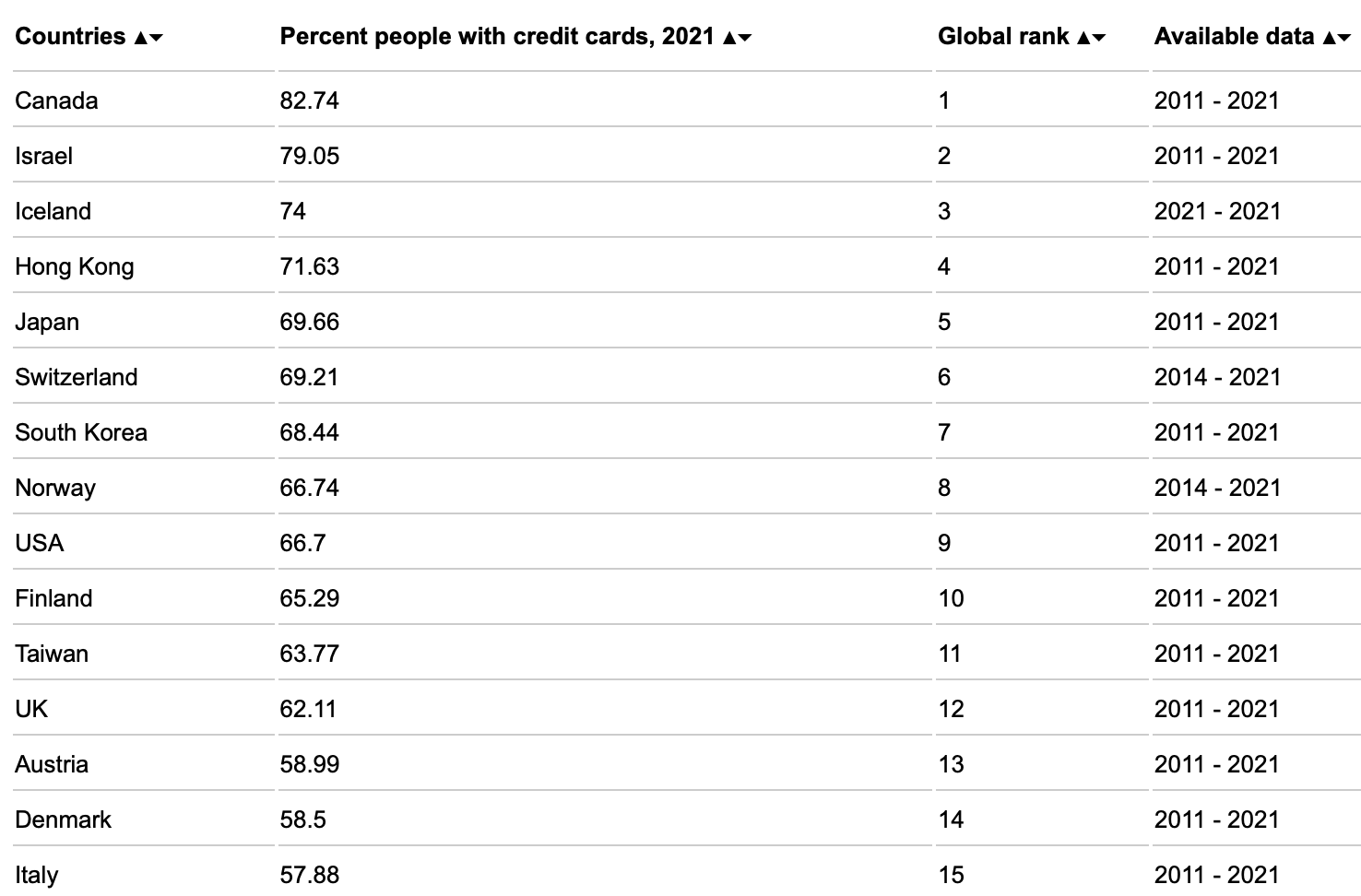 This chart isn't helpful. Americans have more cards per person than many of those countries, and more importantly, the presence of cards doesn't tell us about debt. Americans carry the most long term debt, with more than half of users here leaving a balance unpaid at some point and nearly 1 in 5 having over 15 years of carried debt on their credit cards."American Way" despite 8 other countries having a higher percentage of people with credit cards and several more close behind.