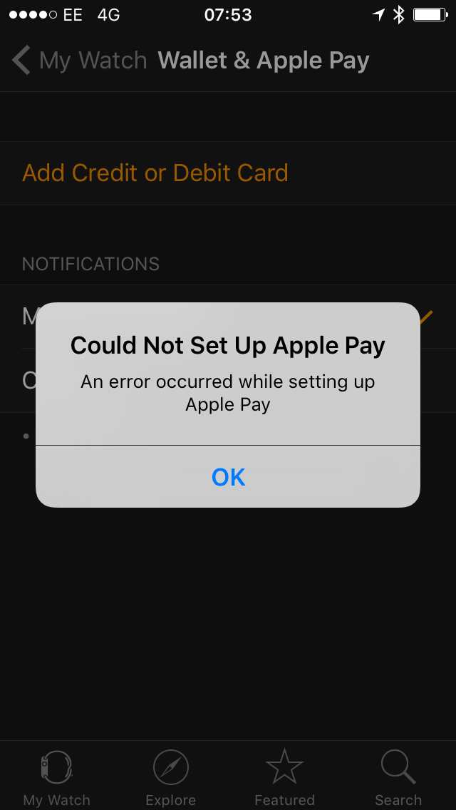 TESCO? They are not on the list of Apple Pay retailers. You sure...Anyone managed to get their card on their Apple Watch? Works fine on the phone and I was able to pay at Tesco but whenever I try to add the card to my watch I just get "Could Not Set Up Apple Pay - An error occurred while setting up Apple Pay"