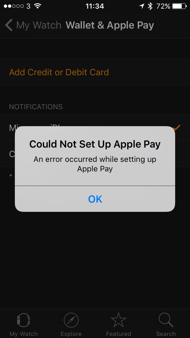 ditoAnyone managed to get their card on their Apple Watch? Works fine on the phone and I was able to pay at Tesco but whenever I try to add the card to my watch I just get "Could Not Set Up Apple Pay - An error occurred while setting up Apple Pay"
