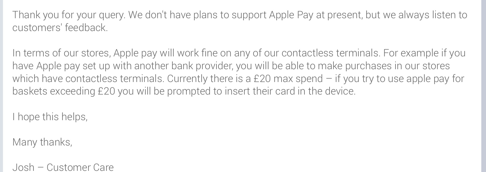 Morrisons was a disaster. TouchID recognition failed - probably due to sweaty fingers - and then when it finally did work the system went into processing mode and eventually the transaction declined. Again the phone said it was a success. Not sure what caused this seeing as it should work everywhere but Morrisons saying on Twitter that they will support from tomorrow. The slightly rude self checkout assistant tried to tell me that it was Apple Watch only.