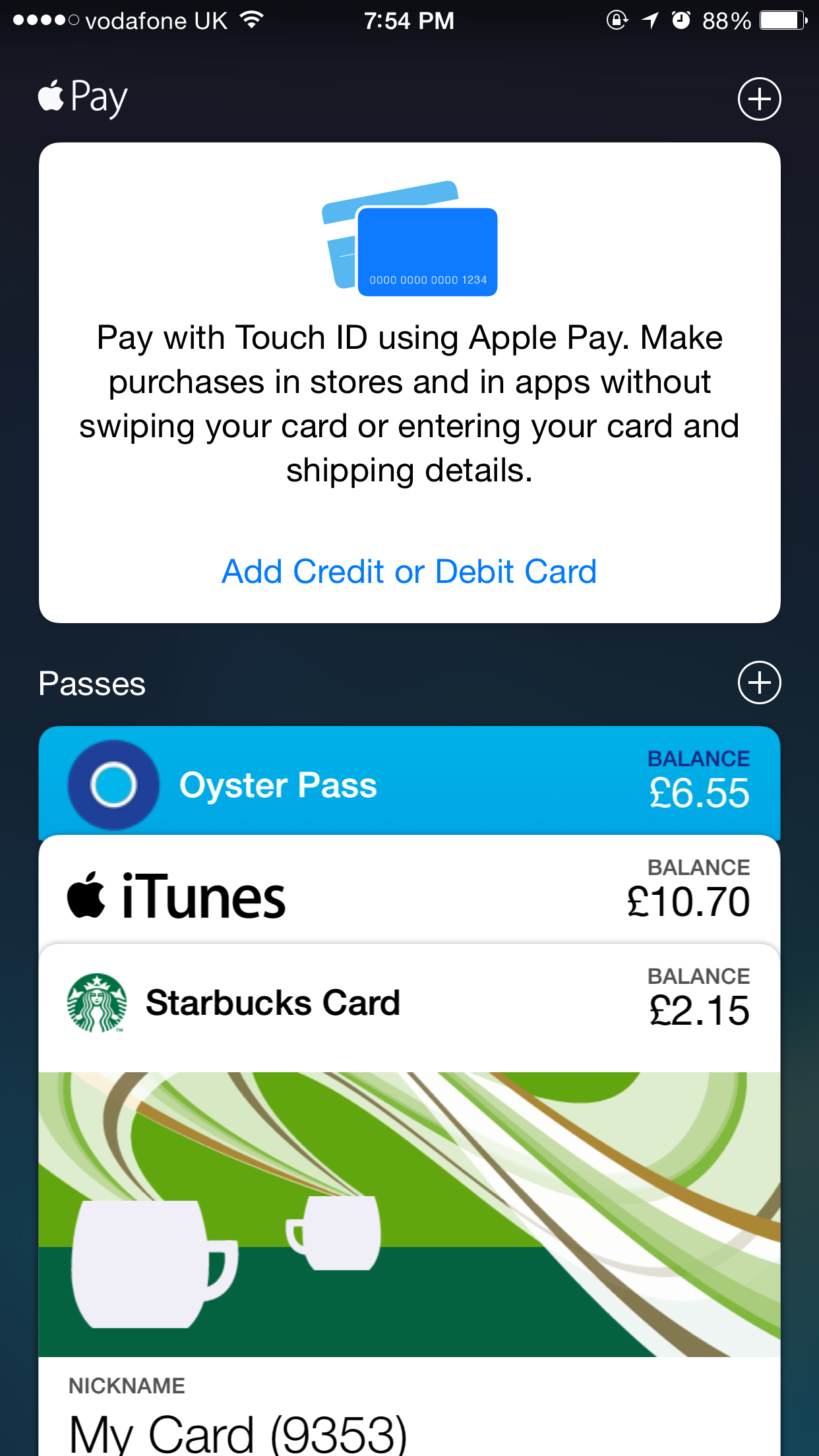 hi there, i checked my phone this morning at 5:30 am when i got up and clicked on passbook (wallet iOS9) and the Apple Pay option came up, added Santander debit card. Wallet didn't show in settings but after restarting phone it showed upCan anyone from the UK running the public beta of iOS 9 see anything in wallet for Apple Pay?