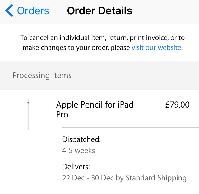 That sucks.Getting a bit peeved here - I ordered the iPad pro and Pencil online from the Apple Store as soon as I could on launch day - got the iPad last week, but Pencil is still stuck at "processing". I feel that online orders should have been honoured before sending stock to stores - I would check my local Apple store in Edinburgh, but that's an hour bus journey from me. Dying to try out the Pencil...........