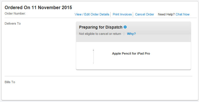 My 11:30 11/11 UK Pencil order is still Processing, even though my AMEX card had a pending £79 from Apple appear on Friday (normally a sure fire sign that an order is about to prepare for dispatch). However this morning I noticed that the pending £79 has gone! It looks like there has been a major 'muck-up' with logistics, and an batch due in to Apple UK (Syncreon) on Friday did not arrive. Could explain why UK Apple Stores don't seem to have any pencils so far this week.