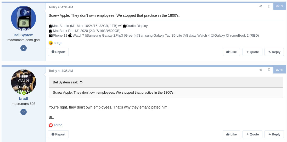 BellSystem said "Screw Apple. They don't own employees. We stopped that practice in the 1800's." and you replied that they emancipated him.
