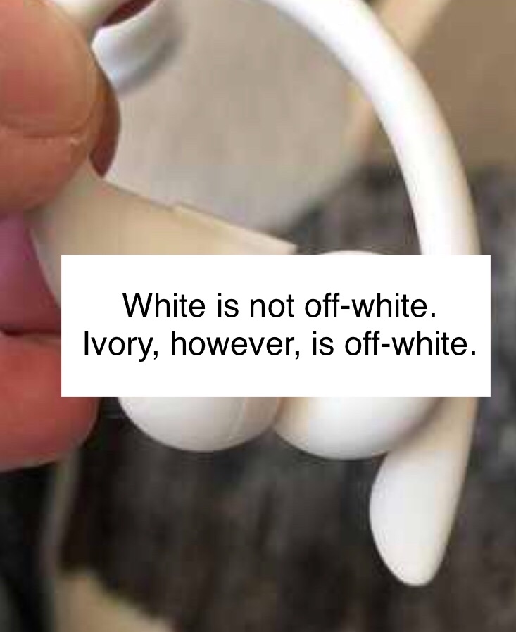 Your original point may have gotten lost when you switched from “not beige” to “clearly white regardless of what Apple calls them.”Ivory is essentially off-white. They are not the beige tinted depiction in the product photo from the Beats website, which was my original point before people felt the need to chime in and say otherwise, for some reason.