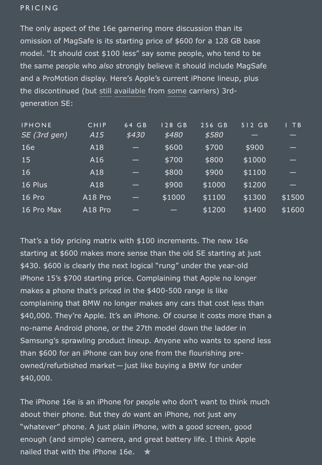 Well I have no idea who the target audience is for the 16e so…You think the target audience for the iPhone 16e cares what MKBHD or Gruber or YOU thinks about the phone? All this feigned outrage is performative nonsense that exists because "Influencers" need clicks and tech nerds like to complain on forums.