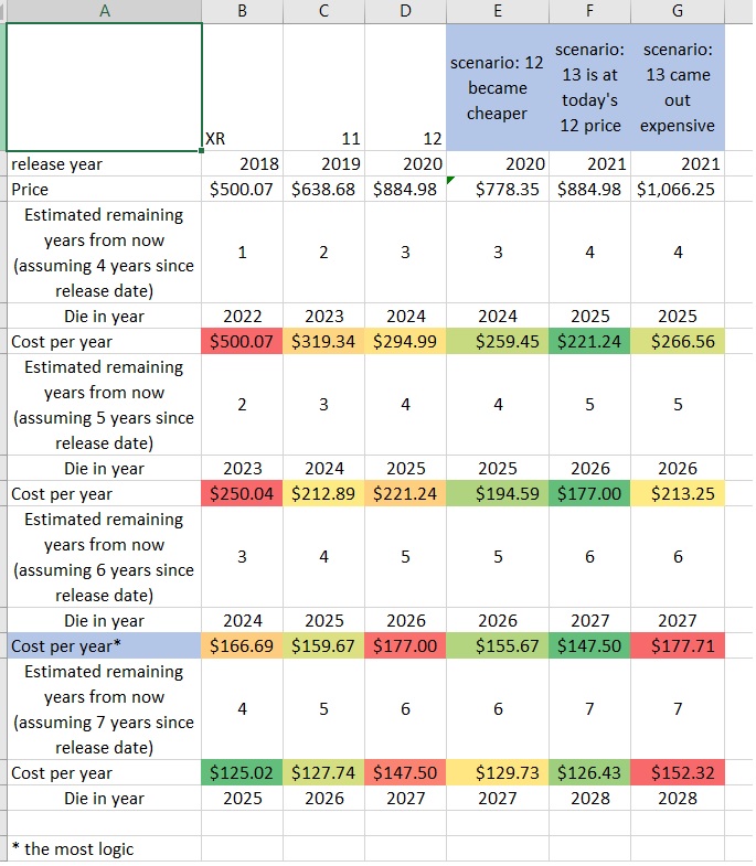 Very impressed with your financial analysis spreadsheet OP! Based on your preference, the XR looks to be a good choice as an official Apple refurb at $470 (but only Apple refurb, i would not risk a refurb from anywhere else personally). If you can find an iphone 11 for only a few dollars more though, get that instead.Thank you everyone. I have made a humble analysis to see if the XR cost would make sense versus 11, 12 and if I waited 2-3 more months for the new 13, giving the number of years each phone can last (5 years vs 6 years vs 7 years). I included sales taxes in the prices, and I think it make the most sense to just wait for the new one and buy it. Would appreciate any feedback on that analysis.View attachment 1801129