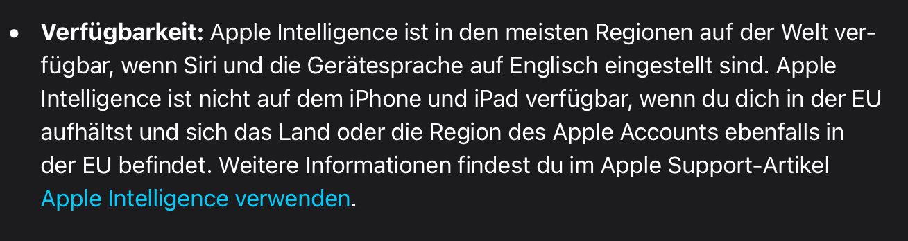 Nope. I didn't use it before. But it tells me on German not, that it's not working, because I'm in the EU. v.vDid you have it in English before? I am currently using it on iOS 18.3. Wonder if it will continue to work once I set my iPhone to German on the 18.4 beta since I am already past the waiting list thing