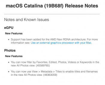 Update: According to Apple's release notes, macOS Catalina 10.15.1 introduces support for the AMD Navi RDNA eGPU architecture and brings some changes to Photos. You can now filter by Favorites, Edited, Photos, Videos, or Keywords in the All Photos view, and you can choose View > Metadata > Titles to enable titles and filenames in the All Photos View.