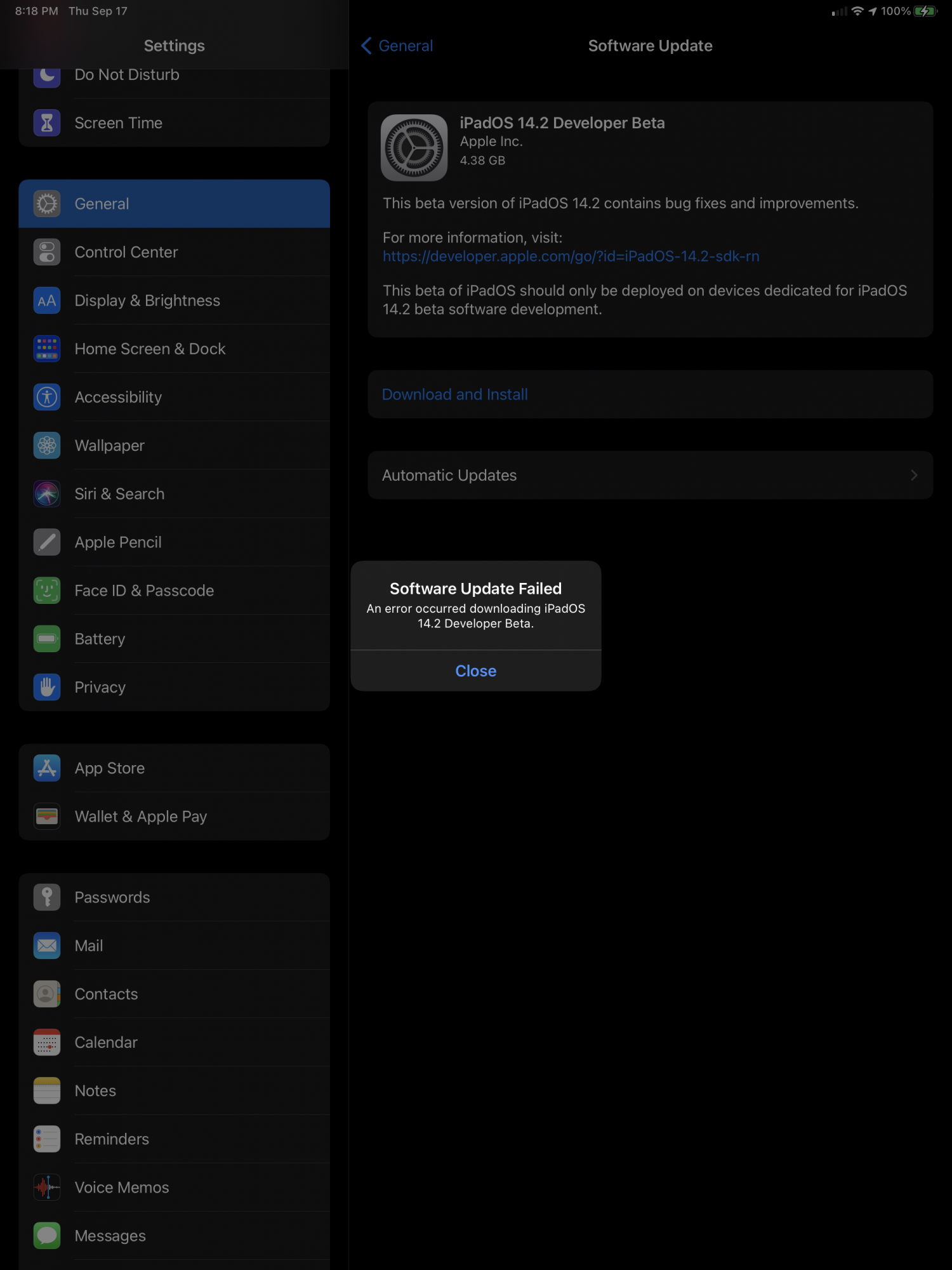 I keep getting this error on iPadOS and iOS. Anyone else getting this error? I’ve tried everything. Restarts, deleting and re-pushed profile etc. this has been one of the most difficult updates to download and install in a long time.