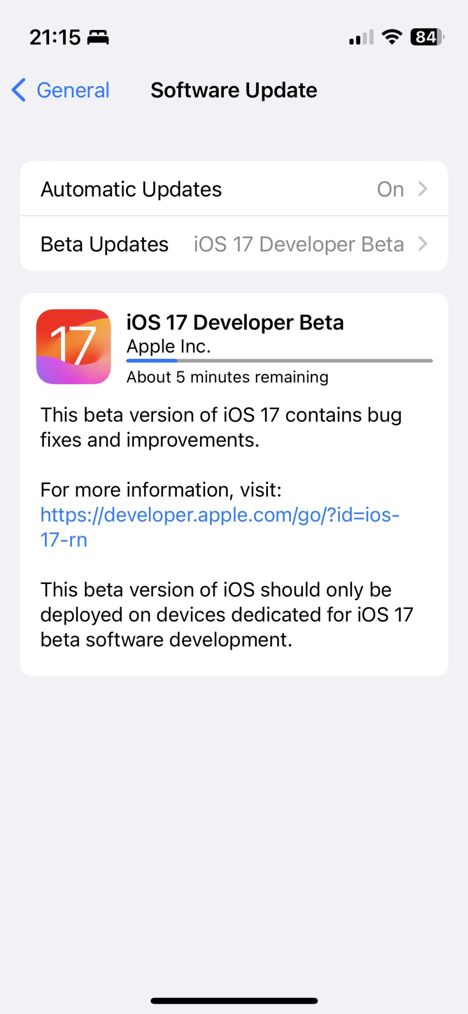 Registered developers are able to opt into the betas by opening up the Settings app, going to the Software Update section, tapping on the "Beta Updates" option, and toggling on the iOS 17 Developer Beta. Note that an Apple ID associated with a developer account is required to download and install the beta.