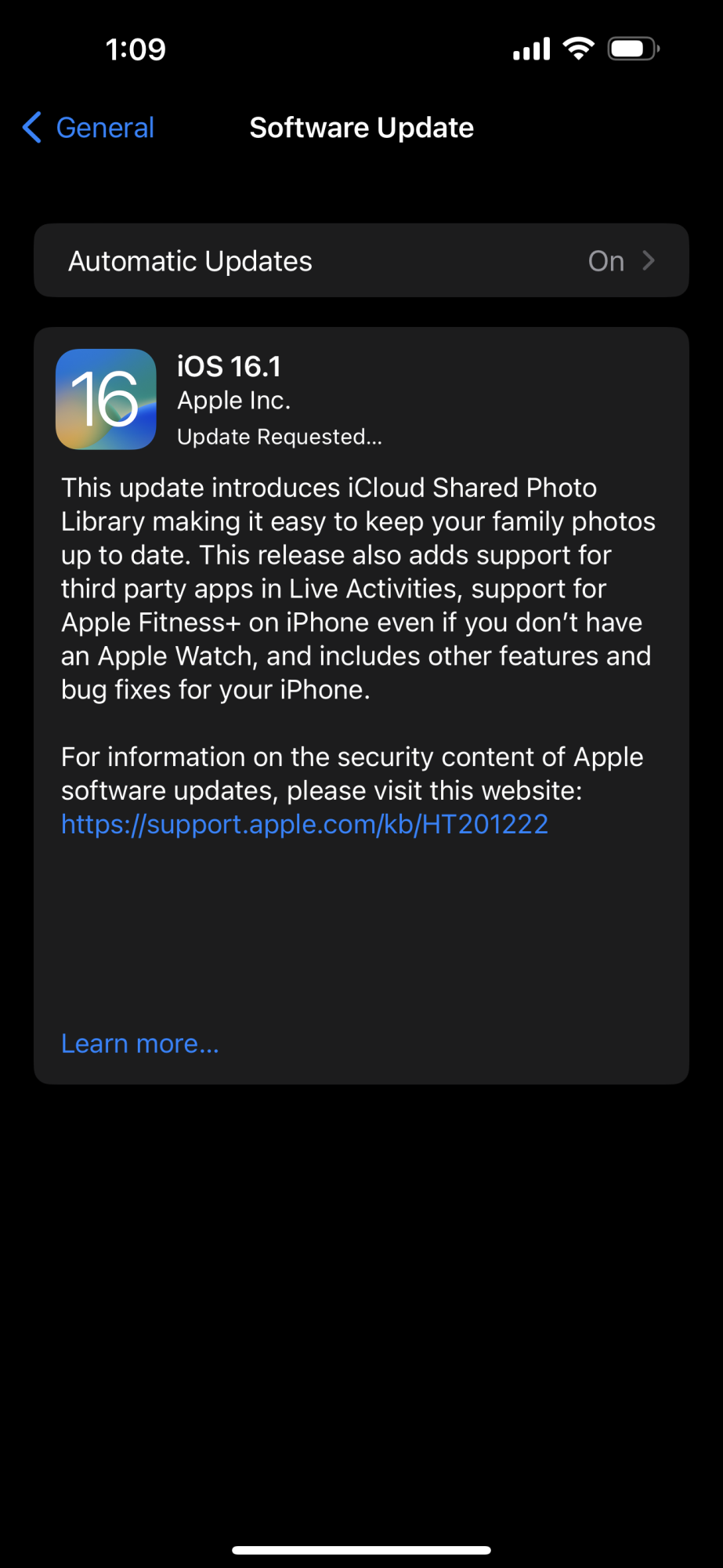 And after 5 minutes of that, it’s at “Preparing Update”. Why is everything related to iOS 16 so messed up? I mean, minor inconveniences, but still…My download has gone strange. It’s been downloading for a while, and had just a few minutes left, but now it went back to “Update Requested”. Huh?