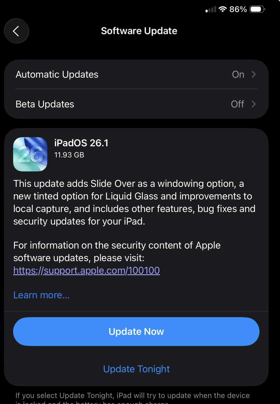 Now that the 26.1 update has been released, I again get the same error of insufficient space available. Apple has effectively bricked my "supported" iPad by making me jump through ridiculous hoops to install security updates.