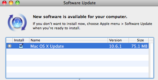 Sure enough, the connection dropped once during the download but wget didn't miss a beat and promptly reopened the connection, resuming where it'd left off. Seconds later, I had a 10.6.1 dmg image, and am now booted into 10.6.1.