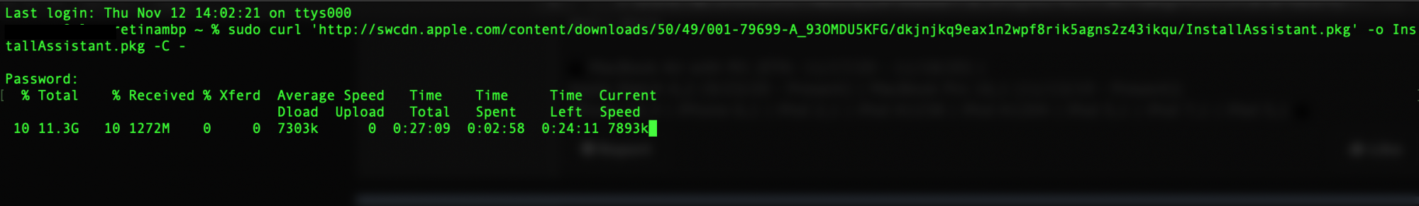 Code:sudo curl 'http://swcdn.apple.com/content/downloads/50/49/001-79699-A_93OMDU5KFG/dkjnjkq9eax1n2wpf8rik5agns2z43ikqu/InstallAssistant.pkg' -o InstallAssistant.pkg -C -