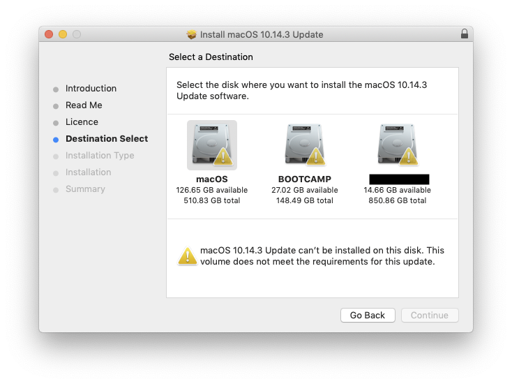 Good morning i had the same problem on both my mac. So this is what i did ,my drives were formated in mac os extended journaled THATS THE PROBLEM that everybody is getting included me so i copied my drive to another that was formated as apsf problem solved rebooted my mac and installed the 10.14.3 on the new drive worked for both my mac .happy as mac & cheeseJust downloaded Combo. Denies to install on the only SSD partition I got (labeled macOS on scr.) Says, "macOS 10.14.3 Update can't be installed on this disk. This volume does not meet the requirements for this update"