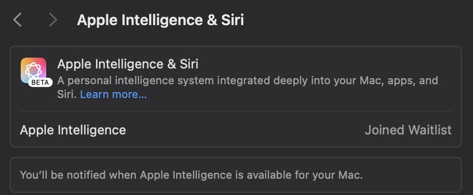 I just updated and it changed from "Siri" to "Apple Intelligence & Siri" in the System Settings.If you are in an EU country, is Apple Intelligent include in the install package and just not enabled? or is it not there at all?