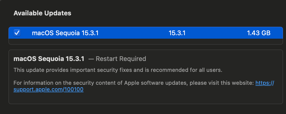 According to Apple's release notes, macOS Sequoia 15.3.1 includes important security fixes, and it is recommended for all users.