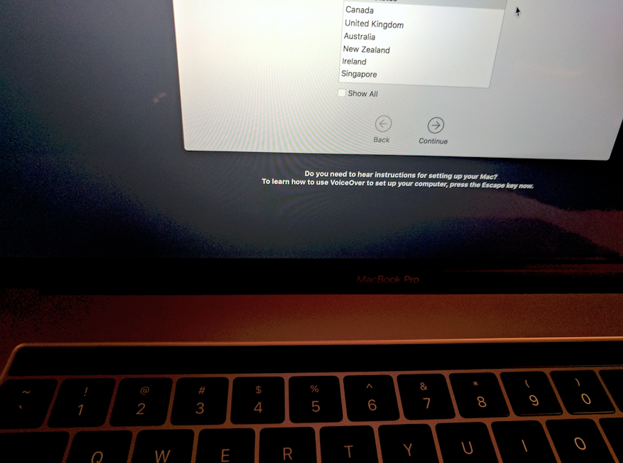 and also because of obvious places Apple didn't update the OS to realize the Touch Bar was there. Example from when I restored macOS prior to returning it (note how the user is asked to hit the Escape key for help... and yet the Escape key [and entire Touch Bar] isn't visible - and couldn't be make visible, at least in my attempts):