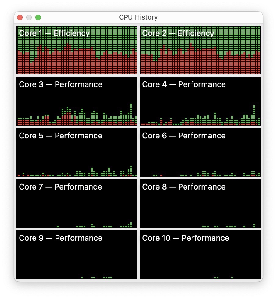 In Activity Monitor, show the CPU History.Oh, it must be so satisfying to see that only the e-cores take care of such tasks, being, you know, efficient and all… minimum heat and power consumption for maintenance tasks.