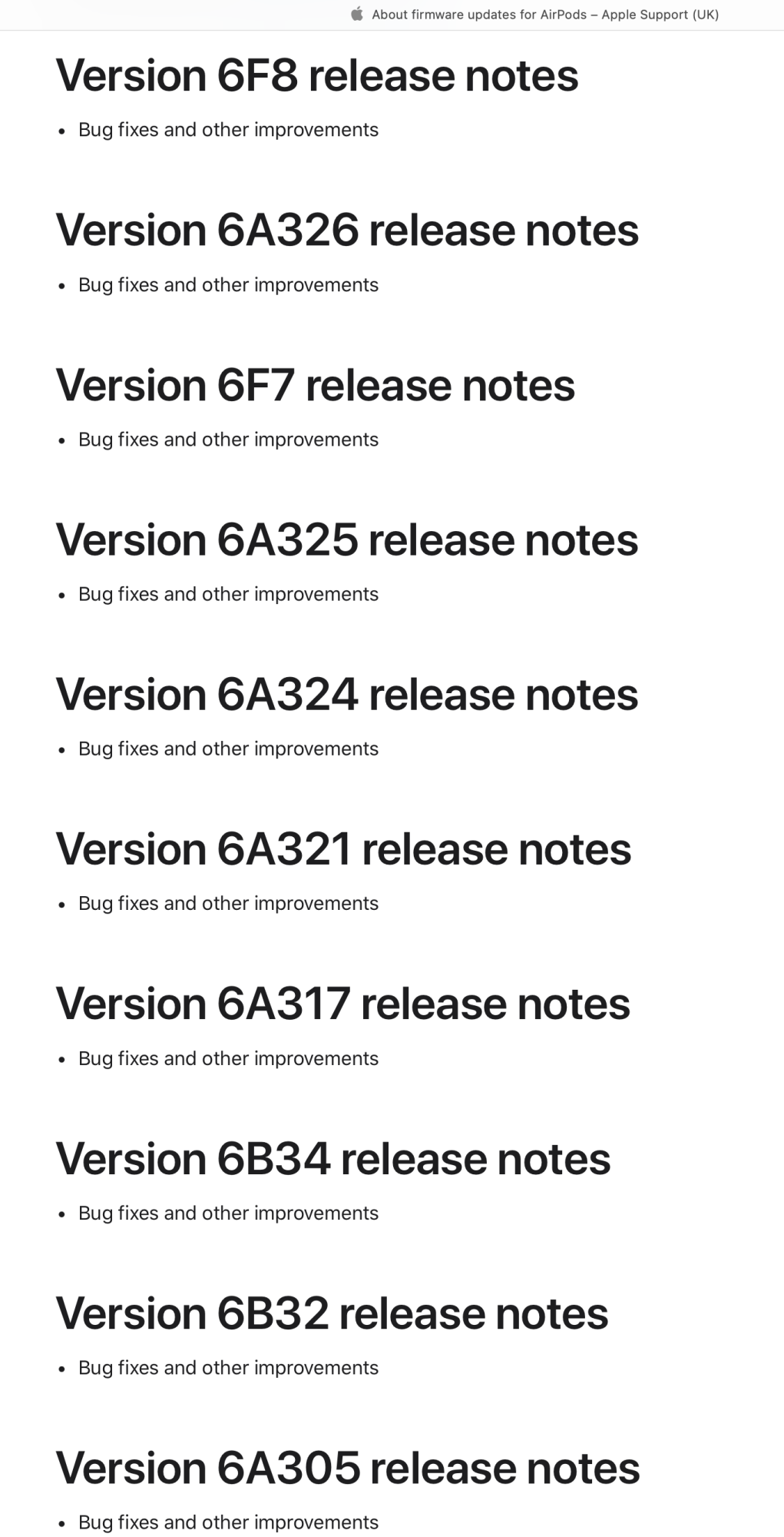 Try finding these versions in Feedback app 😂You know that concept called Bull**** Jobs? I think whoever at Apple maintains the AirPods release notes page may have one.