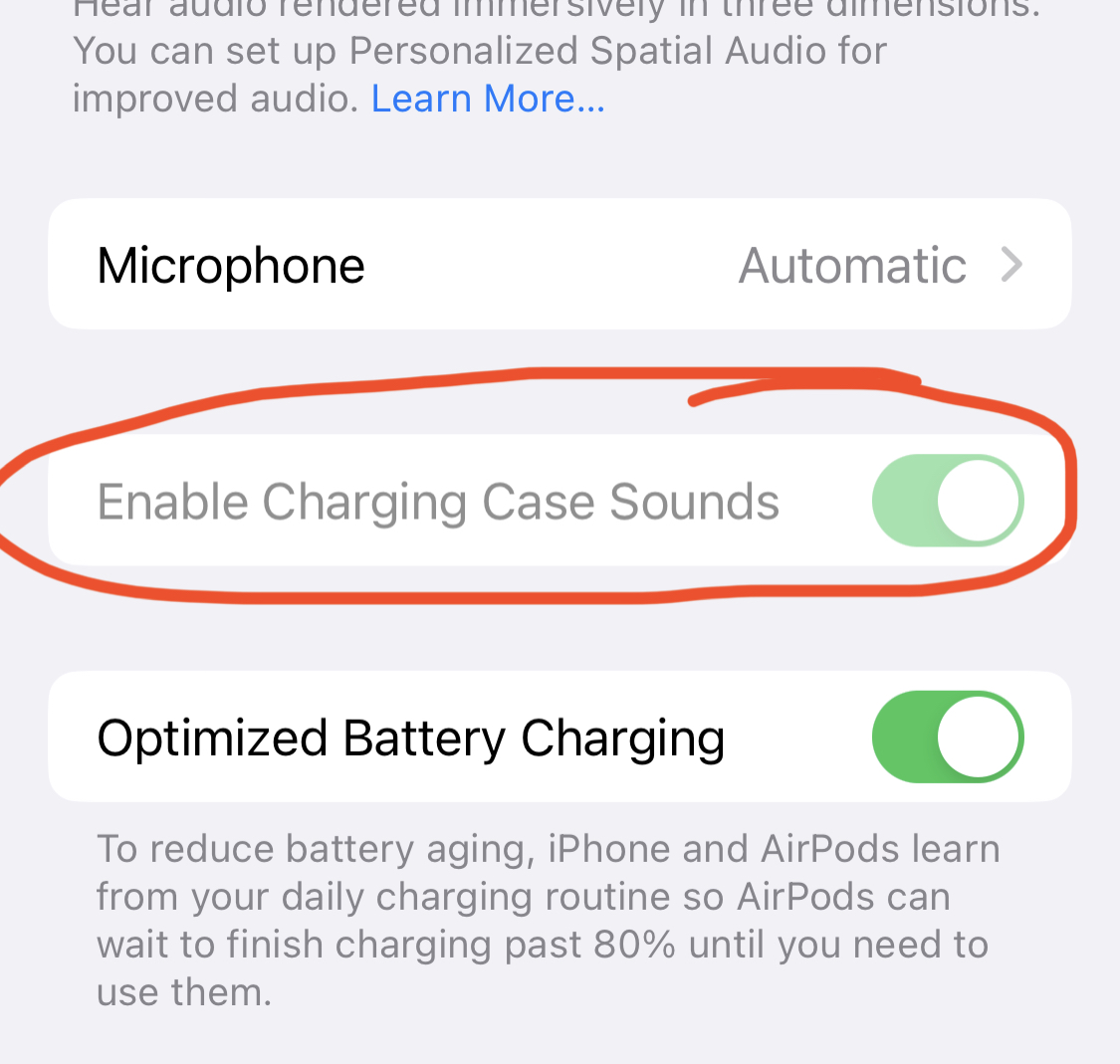 Same problem here. Any solution?Well this is slightly irritating. My AirPods Pro case now refuses to make that pleasant little chime noise when I charge it. The light comes on so I know they're charging, but no sound. The option is enabled by also grayed out in the interface: