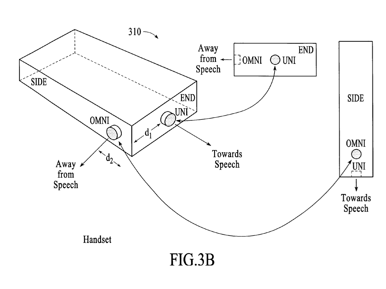 The ’543 Patent also describes microphone configurations wherein a first microphone is oriented toward a talker’s mouth, and a second microphone is oriented away from a talker’s mouth, such that the denoising subsystem may subtract noise associated with noise from an acoustic signal that includes speech and noise