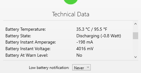 It is also possible to see that it controls the temperature quite well, when the battery reaches 36ºC, it suspends charging and starts charging again moments after it drops to 34ºC.