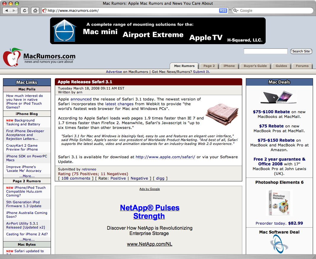 A bit strange to update Safari but we will take it ! But, why now ? Apple wants to put in place the latest version of Safari in the wild so they have time to fix it with 3.1.1... Then, we should expect Apple to bring updated services (.Mac for example) that will build on the new features of Safari 3.1... S Jobs said that in the last investors meeting on march 4th....