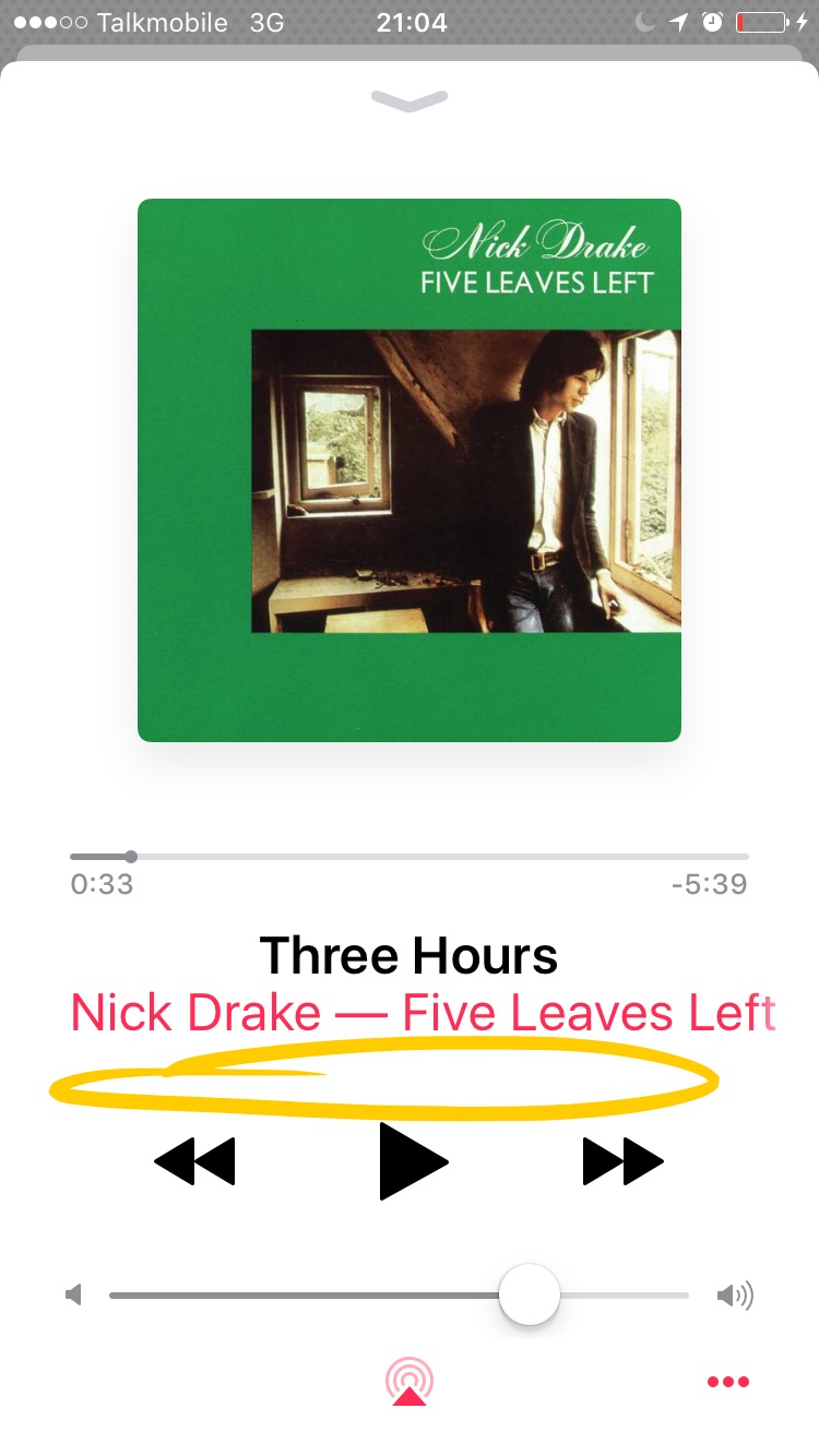 Look at this drag arrow that is begging for Notification Centre to be dragged in everytime you try to touch it! I've been using the App for ten minutes and its already happened five times. Spotify put that control on the right hand side so that it doesnt interfere with Notification centre. How can Apple get that so wrong on their own OS? Incredible.