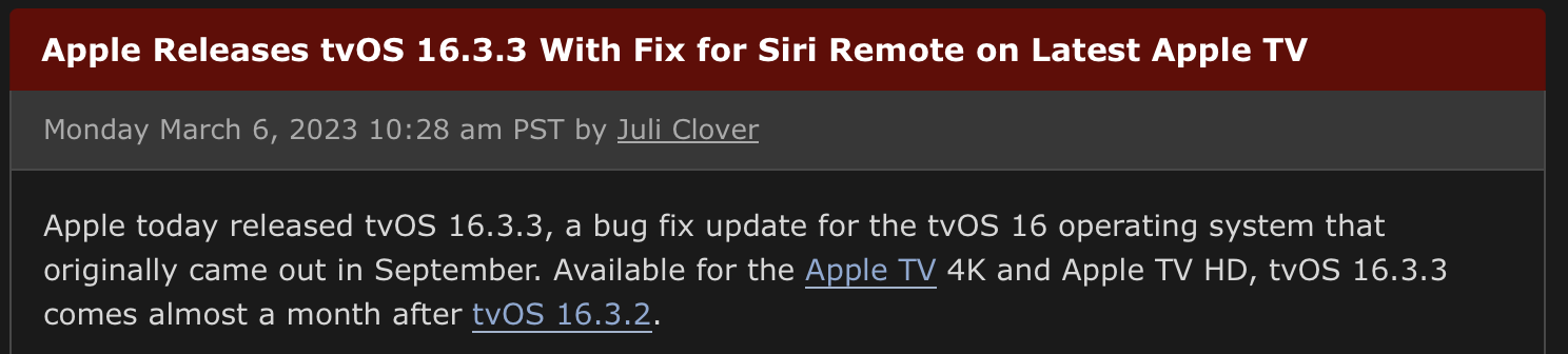 The tvOS 16.3.3 only showed up on my 2022 128GB Apple TV 4K with Ethernet... not on either of my previous 2 generation Apple TV 4K devices.I have 2 Apple TV 4K devices, and still no update on either here as well.