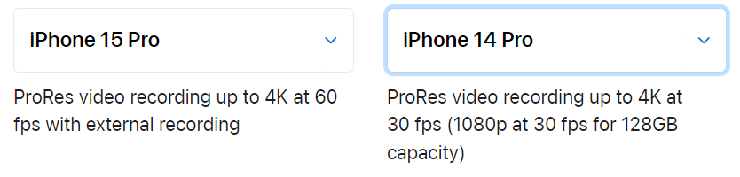 This is the problem, not the storage itself. You buy for your needs, including storage. Not everyone is going to record video at max resolution (if video at all), but people who do should be informed about limits so they don’t run into hassles..Apple does not mention this information on the iPhone 15 Pro's tech specs page on its website, but the limitation is listed when comparing the iPhone 15 Pro to another iPhone model in the Apple Store app, as seen in the screenshot below.