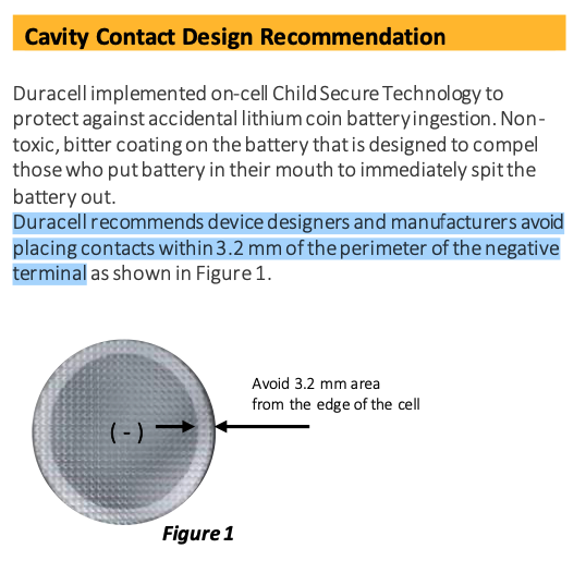 Duracell recommends to manufacturers to put the negative contact further 3.2mm from the edge of the battery (odd wording because they SAY perimeter of the negative terminal but illustrate 3.2mm from the edge of the cell which is the positive terminal).