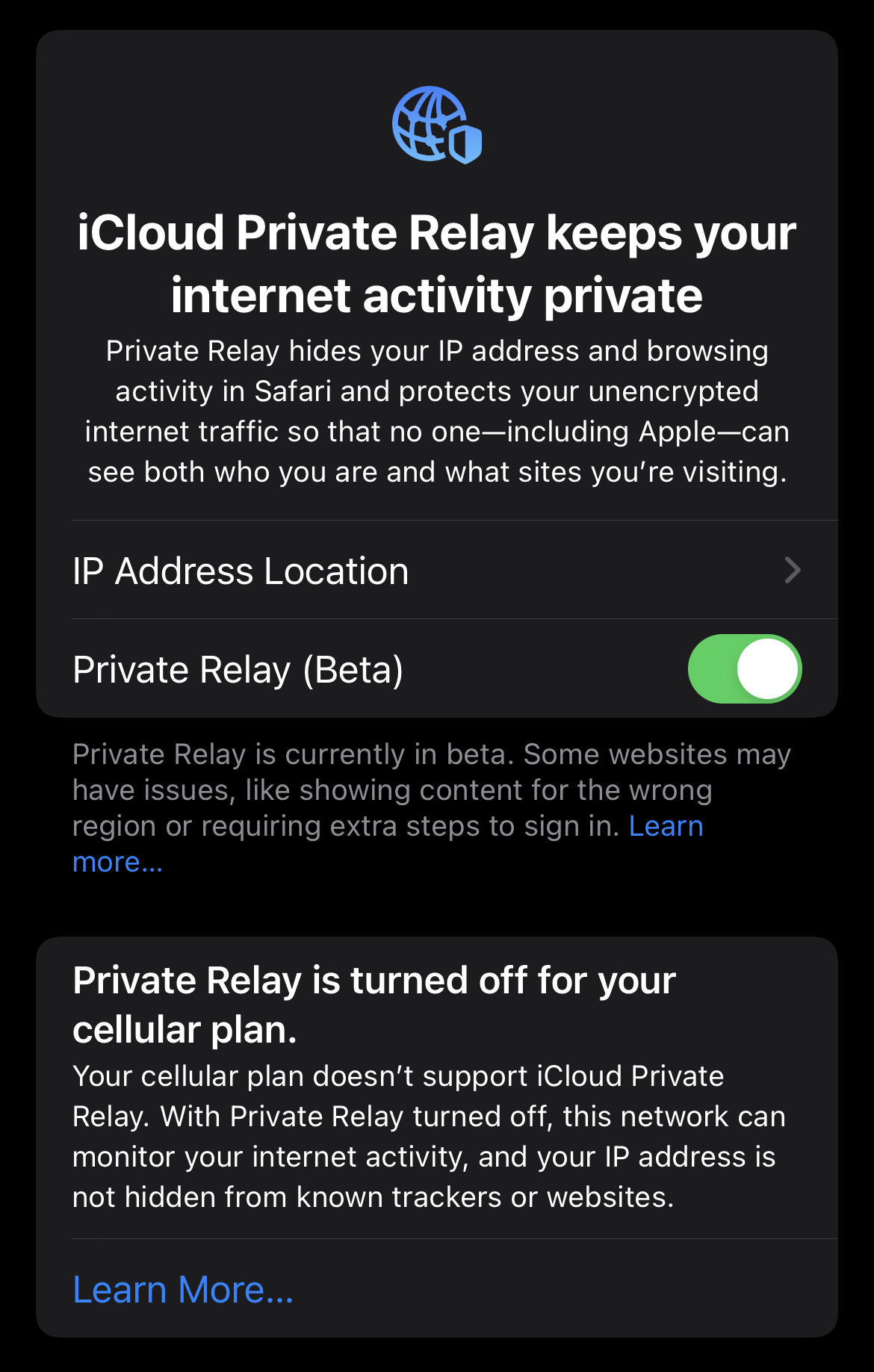 Apple today also made changes in the iOS 15.3 beta to make it clearer what's going on when iCloud Private Relay is not working for a cellular network. The messaging now advises customers to check their cellular settings if the feature is disabled, rather than simply suggesting a carrier partner does not support it.We wanted to update what we shared earlier. Apple doesn't change customers' settings when they update to iOS 15.2. Customers may see an error message if they previously toggled iCloud Private Relay or Limit IP Address Tracking off in their Cellular Data Options Settings. Apple has more details on their support page for this feature here.
