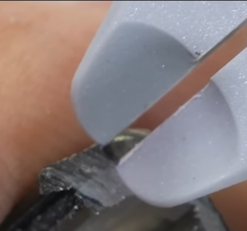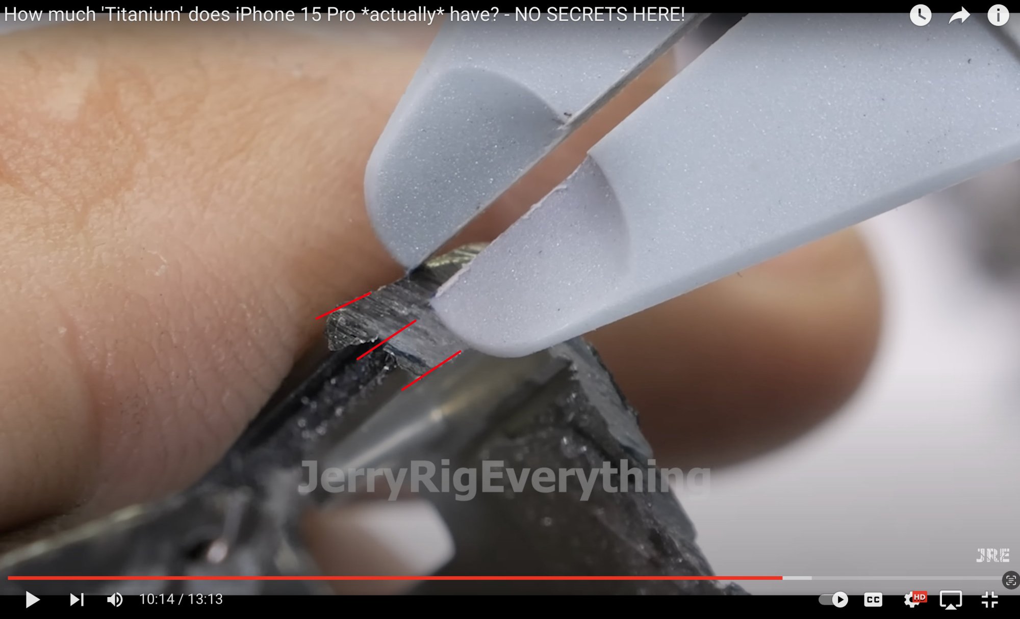 He doesn’t even measure the titanium width accurately. This is apparently 1.05mm. It’s probably more like 1.2 or 1.3 mm and the aluminium is maybe 1.4 in this section?? Who knows, he didn’t measure it accurately. You certainly don’t know. The area closest to the left shows clearly there is more titanium.