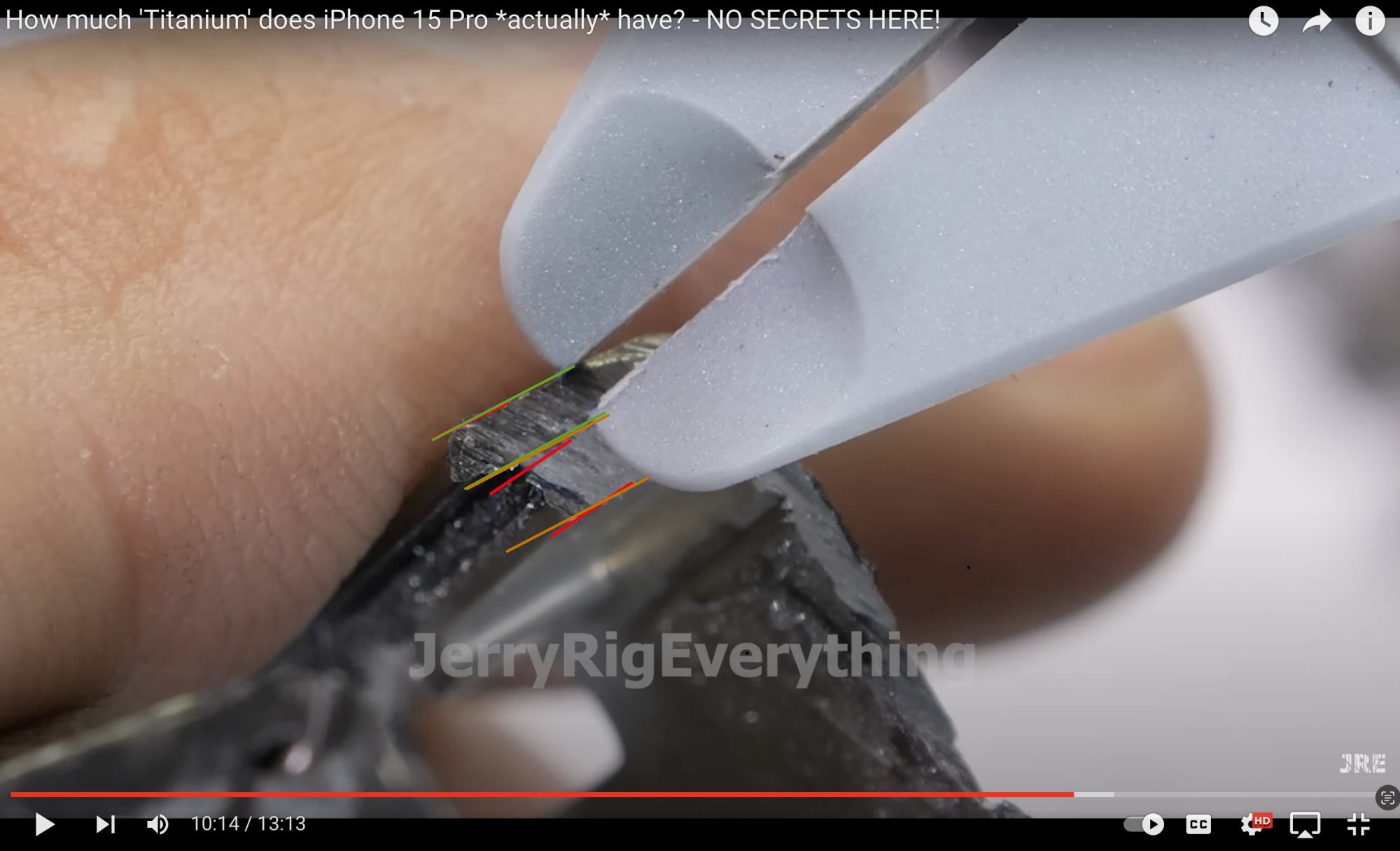 The cut wasn’t straight. If you notice in your screenshot, the entire bottom of the frame is missing from the left edge. So, yes, only the metal present, titanium, was bent at the edge.But somehow the cut didn't bend the aluminum to make it look thicker? Nice trick you've got there.