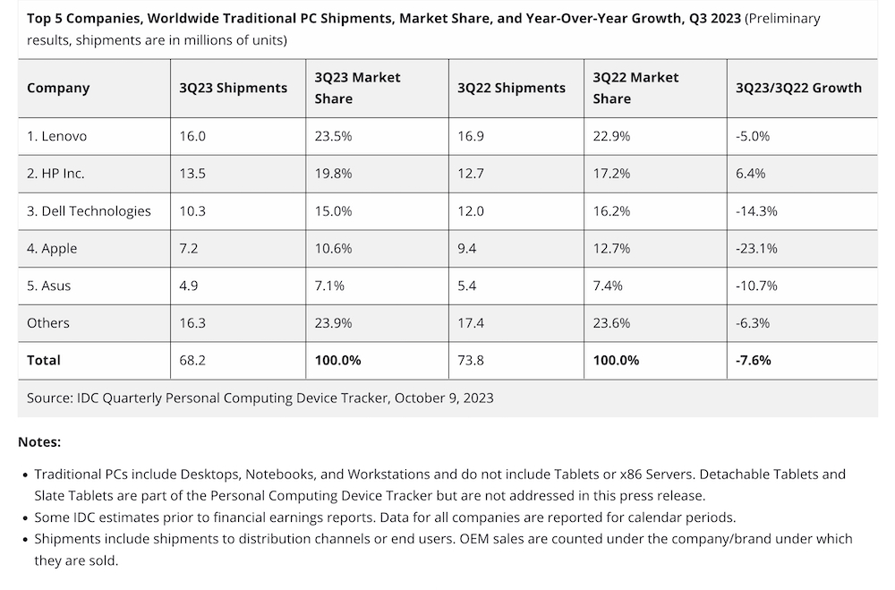 Source: Global PC Shipments Decline Again in the Third Quarter of 2023 Amid Signs of Market Improvement, According to IDC Tracker