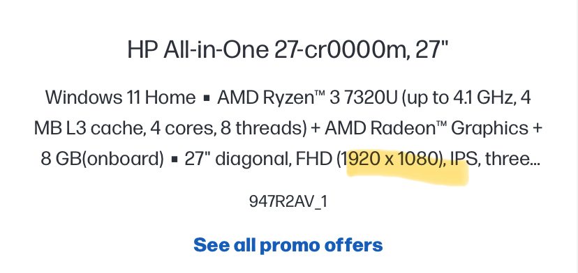 I don’t know about the others but the HP 27” is only 1920 by 1080 pixels.If you need a big screen setup waiting for Apple to deliver it as an AIO could be a very long wait. On the other if you can tolerate Windows then I believe HP, Lenovo and Asus each have a 27in AIO desktop available.