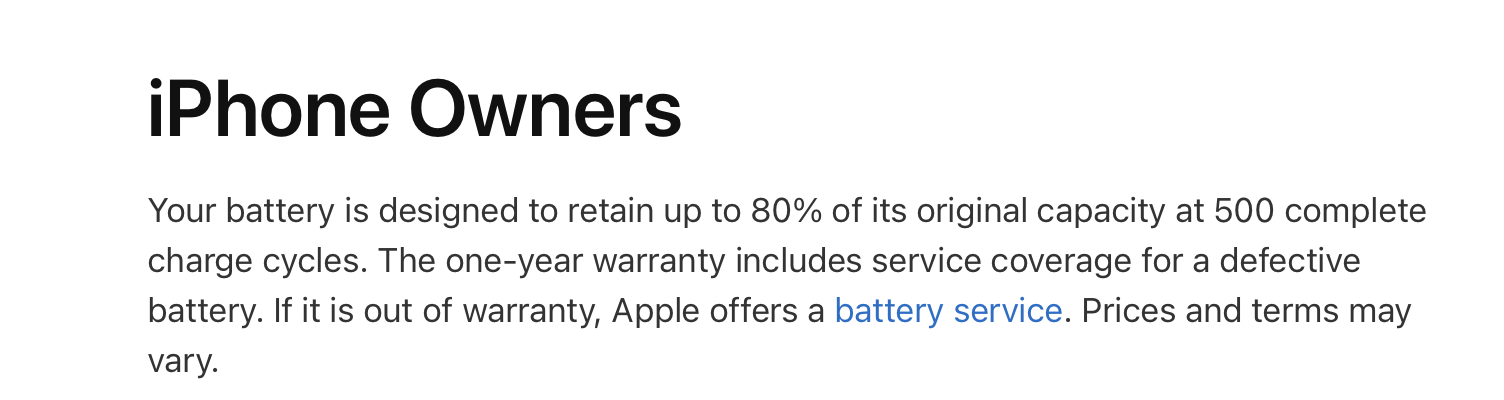 "Your battery is designed to retain up to 80% of its original capacity at 1000 complete charge cycles. The one-year warranty (for Apple Watch and Apple Watch Sport) and two-year warranty (for Apple Watch Edition) include service coverage for a defective battery. If it is out of warranty, Apple offers a battery service. Prices and terms may vary."Where is it on Apple's website? I wouldn't have bothered sending it in if it said this on the site. Also none of the people on Business Chat or on the phone mentioned it to me until today.