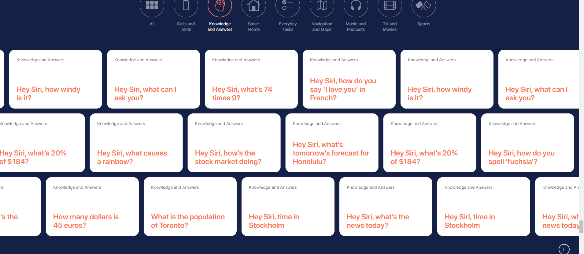 In addition to this, the unpublished syntax appears to be changing over time, constantly tinkered with on the back-end, but with no notice to the users about new or changed rules - for instance, I had many times where I'd say, "Hey Siri, play 'Accidental Tech Podcast'" (the bit in apostrophes is the literal name of the podcast), and Siri would say, "Playing Accidental Tech Podcast" and start playing the latest episode. And then there was a period of time where I'd give the same command and get back "There's no podcast named 'Accidental Tech'", and then some weeks later, the same command started working again.